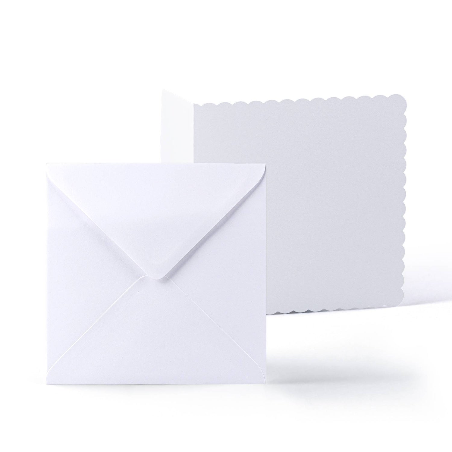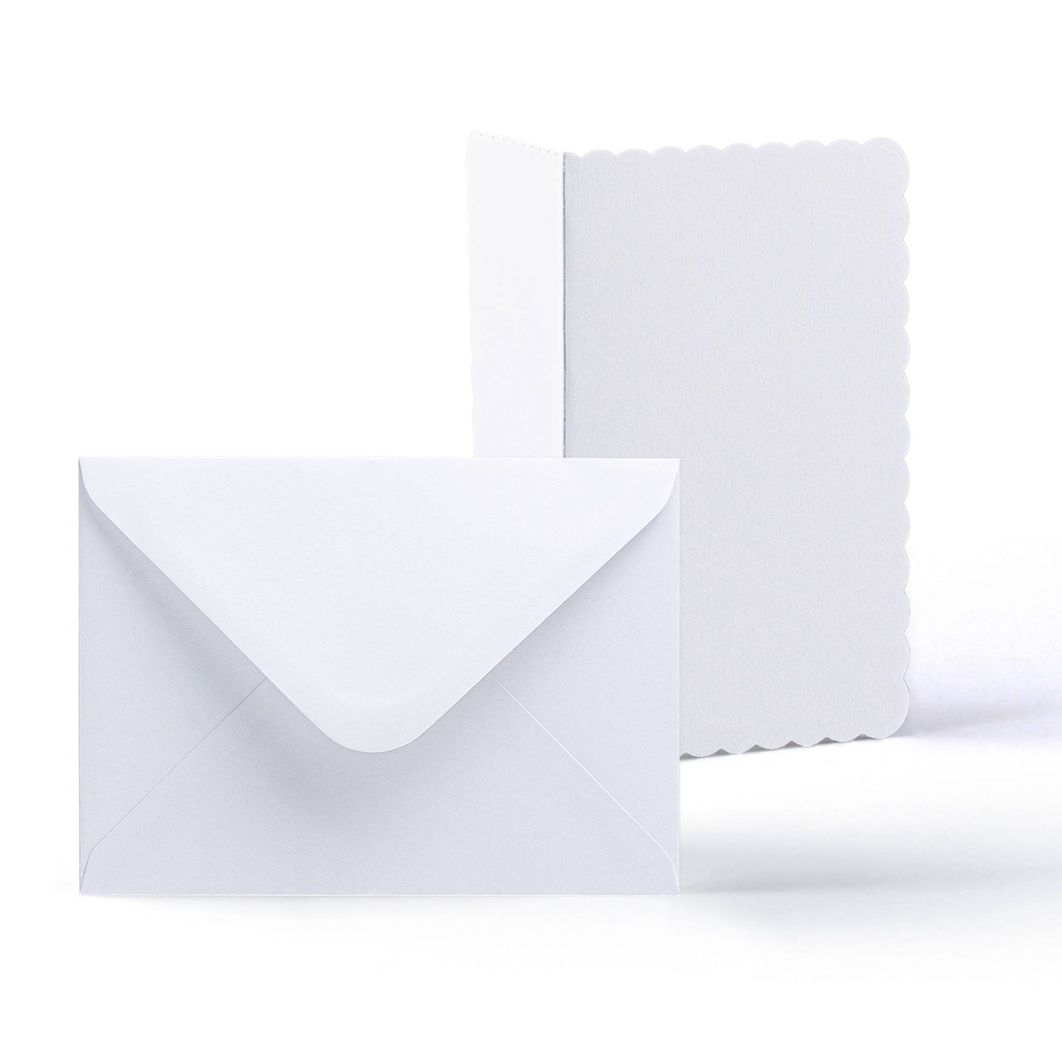 Elegant white scalloped cards (300 gsm) with matching envelopes (100 gsm).